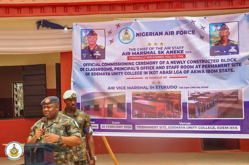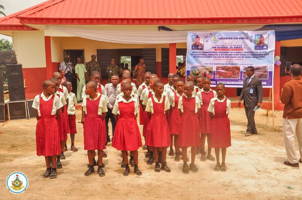 The Nigerian Air Force (NAF) has further strengthened its Civil–Military Relations (CMR) footprint with the commissioning of a newly constructed block of classrooms and staff offices at the permanent site of Edemaya Unity College in Ikot Abasi Local Government Area of Akwa Ibom State.