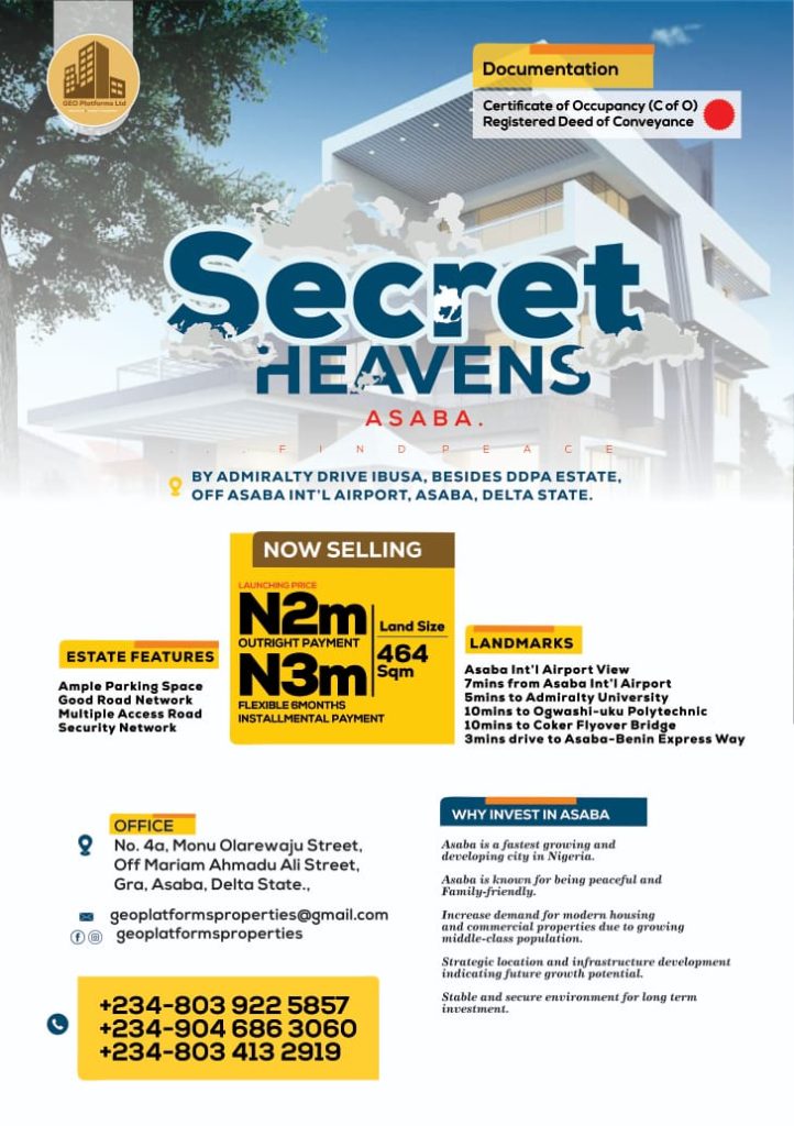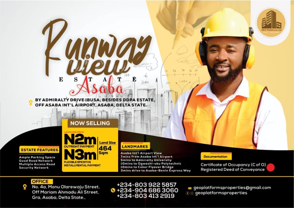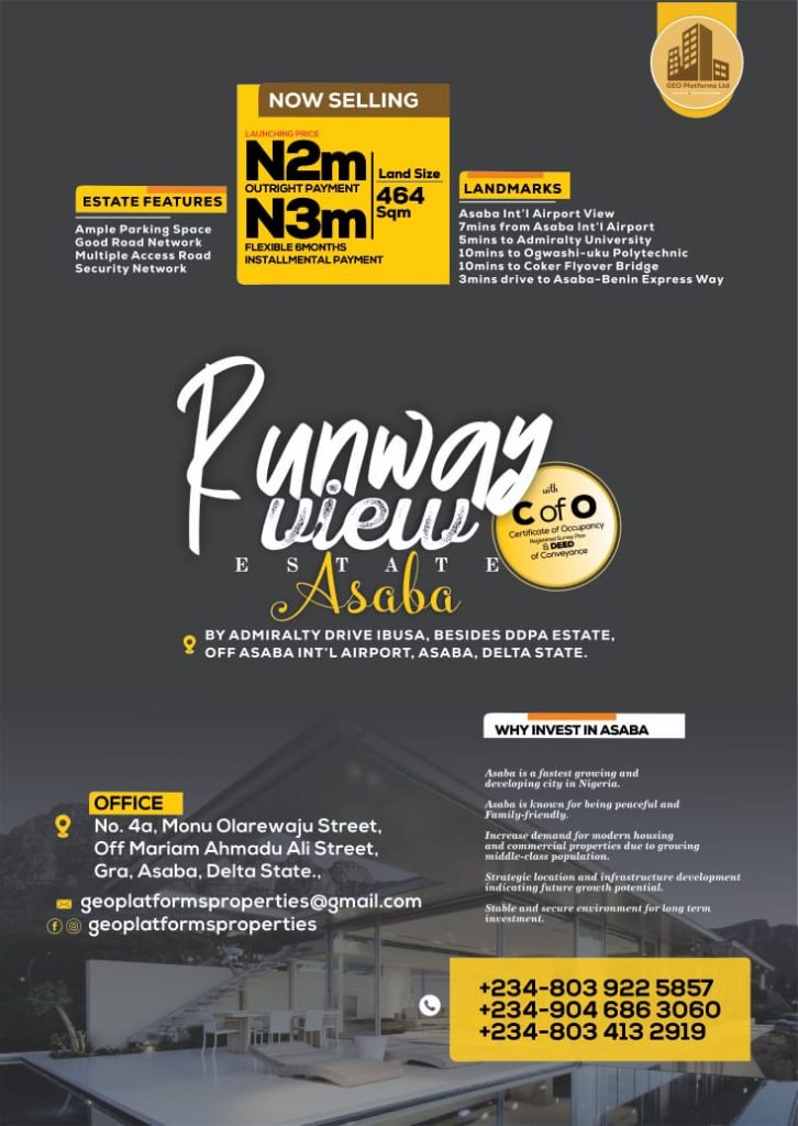 In an exciting development for potential real estate investors, GEO Properties, powered by GEO Platforms Ltd, has introduced a range of new landed properties in Asaba. These properties, including the Runway View Estate and Secret Heavens Estate, are strategically located in prime areas and are being offered at affordable prices.
